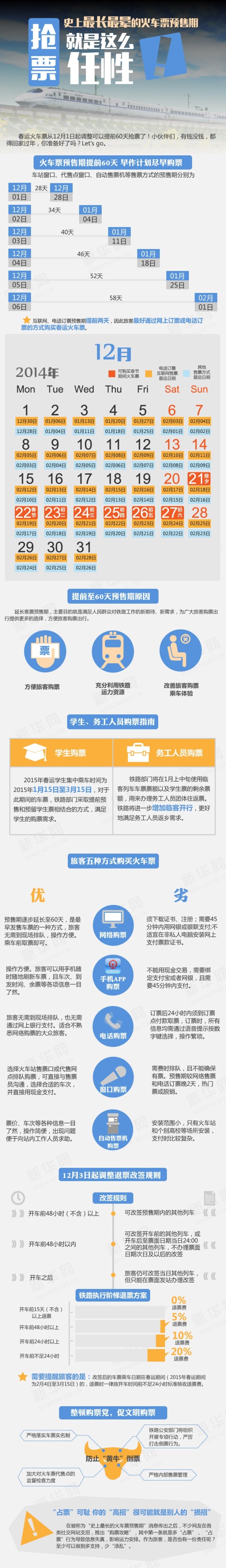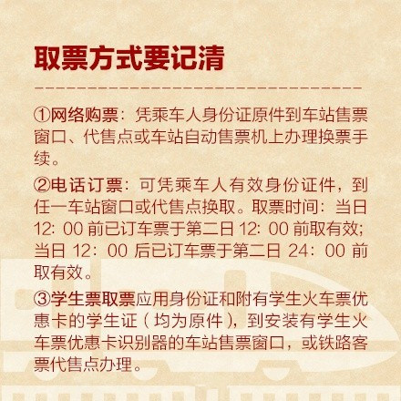 【提醒!】今日起,可通过网络、电话订购春运首日(2月4日)的火车票,售票窗口、代售点的发售时间将错后两天。注意:①火车票预售期改为60天;②取消原有C、D、G字头列车单独起售时间;③开车前15天退票免收退票费;④提前48小时可改签任意车次。