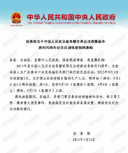 国务院今日发布关于中国人民抗日战争暨世界反法西斯战争胜利70周年纪念日调休放假的通知。通知称,2015年是中国人民抗日战争暨世界反法西斯战争胜利70周年。为使全国人民广泛参与中央及各地区各部门举行的纪念活动,2015年9月3日全国放假1天。