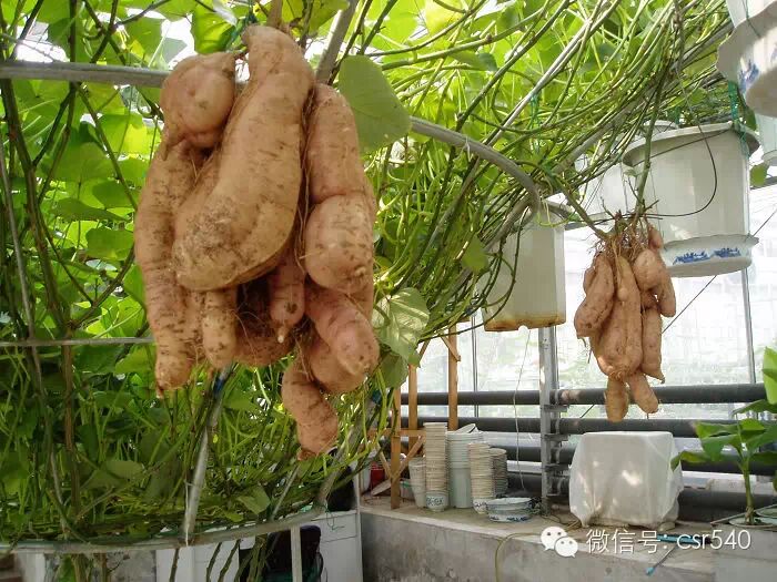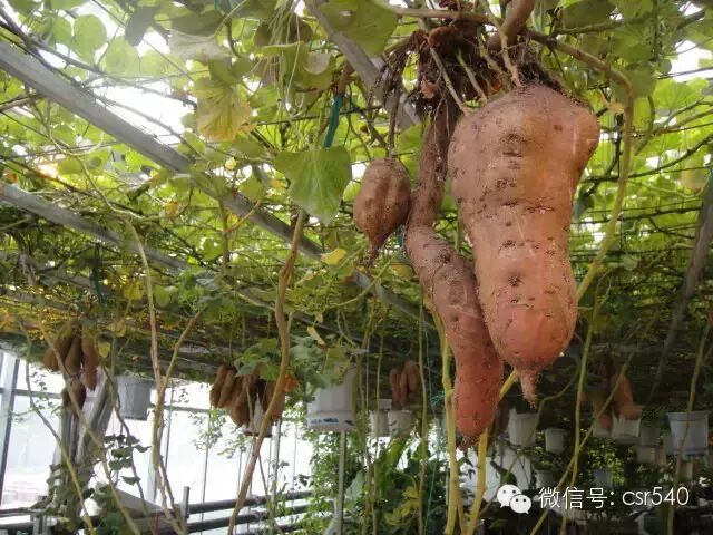 空中结薯,利用深液流栽培,应用国际领先的红薯根系功能分离与连续结薯技术,将红薯由传统的土壤栽培转变成营养液栽培,水生根系为植株提供充足的水肥,压蔓产生的不定根成为储藏根,根系吸收养分和储积养分的两大功能分开,既方便采收,又可实现多年连续结薯,产量可以数倍提高。这种新型栽培法在栽培学研究和农业观光方面具有重要价值.可在海岛、山区等土地贫瘠的地方种植,也可在自家阳台上种植,即可食用,又可遮阴、观赏,一举多得。