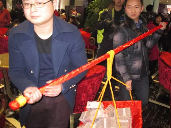 为了能让农民工们将工钱领走,开放商甚至专门准备了几个大箩筐。不少农民工的工资是用箩筐挑走的。