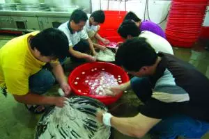 在现场看到,选好料后,师傅们就进行前期处理,将鱼洗净后斩头去尾去肚,然后剔骨去皮起肉,整条鱼转眼间就“脱胎换骨”成为一堆鱼肉。据介绍,一市斤鲜鱼大约只能提取半市斤鱼肉;接着,鱼肉还需进一步变成鱼浆,师傅们将鱼肉置于特制木桶中,加入调料,控制手腕使用掌力快速摔打鱼肉,直至其胶质吐出呈黏糊状。据悉,这道工序大有讲究:要用力又用势,摔打不够,鱼的胶浆不吐,制成的鱼丸松散而没弹性;摔打过度,鱼浆变老,制成的鱼丸则没有脆、嫩的质感。