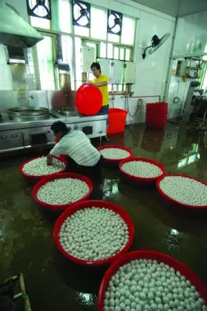 为让鱼丸进一步凝结胶化,每隔5分钟,师傅们便往盆中加热水,以保证鱼丸凝结过程所需水温,这个过程需持续约70分钟。最后再把鱼丸放在开水中蒸煮一下,便大功告成。