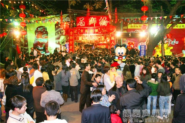 “行彩桥”是揭阳榕城闹元宵的一项传统的民俗文化活动。每年正月十一日前,揭阳榕城的各座桥梁都被打扮起来,挂上各式各样的彩灯,桥的两侧扶手栏杆和桥头柱子上,扎满榕树枝和竹枝,并在彩桥周围悬挂着成百上千幅绣有“合境平安”、“竹苞松茂”、“富贵吉祥”、“国泰民安”、“物阜民安”等字样的标旗彩幅,表达了人们对今天幸福生活的喝彩和对美好未来的向往。现今尽管城内的彩桥很多,但石狮桥仍是人人必行的一条彩桥。