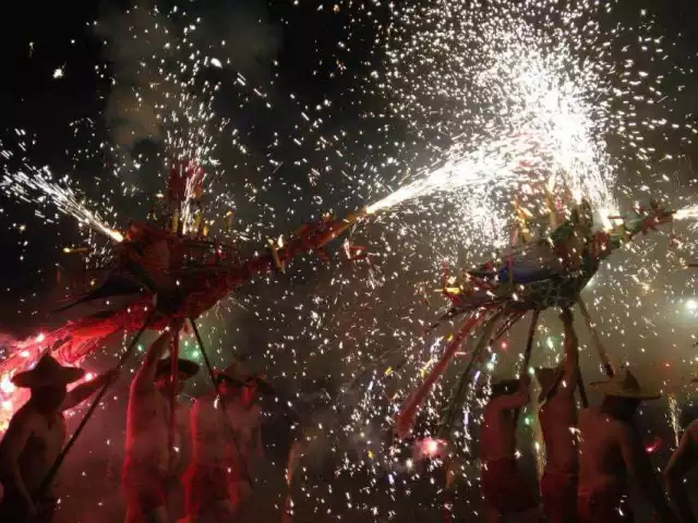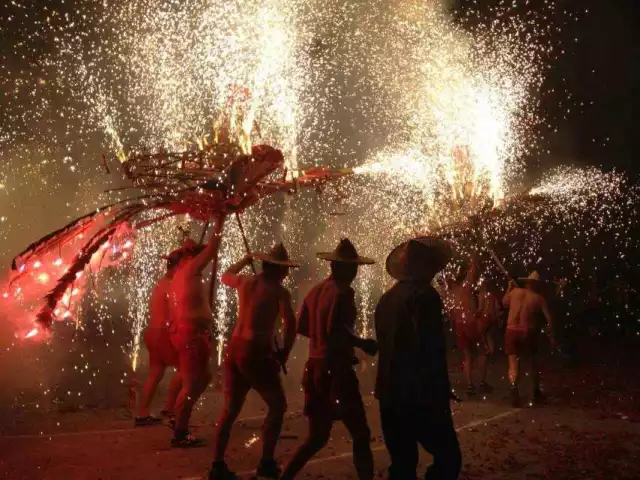 火凤登场,只见四位壮年一组打着赤膊、穿着火红短裤擎着火凤盘旋奔跑,火花随着顺势喷出,与烟火交相辉映,实在是激动人心。