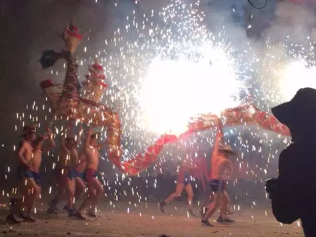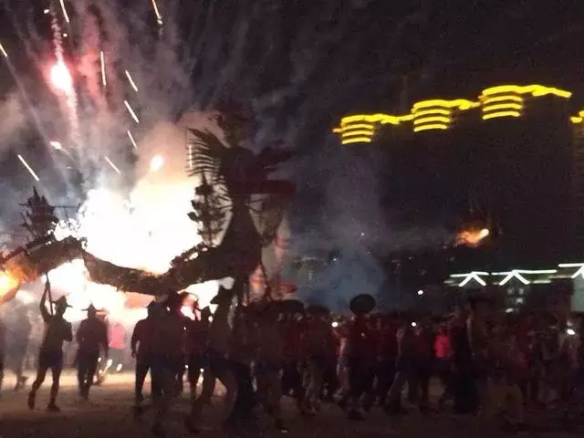小编看得激动,竟忘记了时间,而接下来就是最兴奋的时刻,真正的“烧龙”开始了,龙身及龙头点燃,几十位健儿在烟雾弥漫、火星四溅中擎着火龙奋勇奔跑。呼呼的风声、咚咚的脚步声、噼里啪啦的烟花爆炸声,还有间隙的火箭出筒激烈摩擦发出的尖锐的嗖嗖声混杂在一起,现场达到了白热化,健儿们如有神助,越跑越快,越跑越勇,而后火光越来越亮,亮到所有人都屏住了呼吸,等待着火龙剩下星星点点火光……