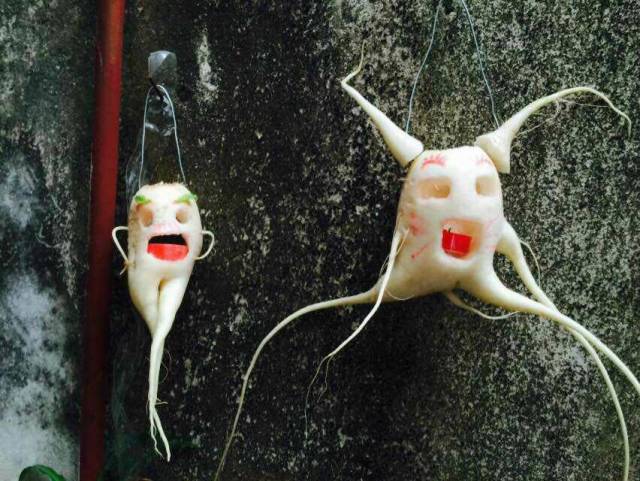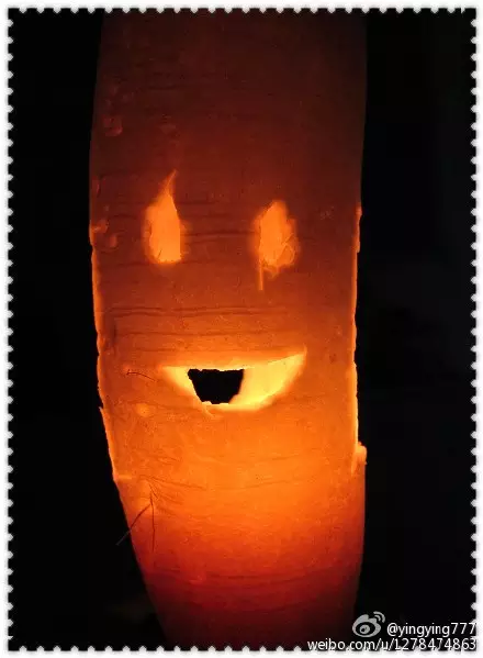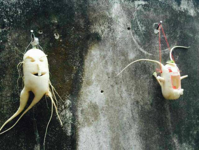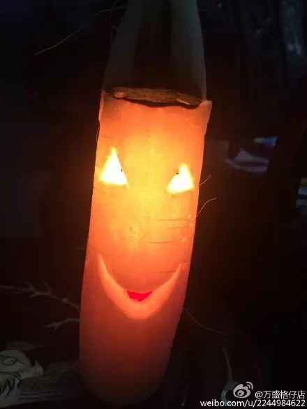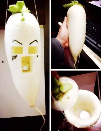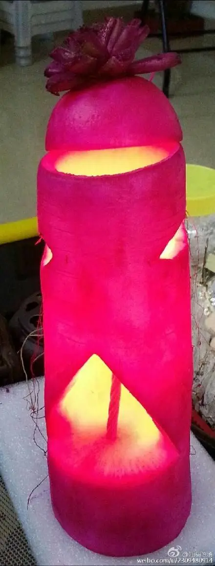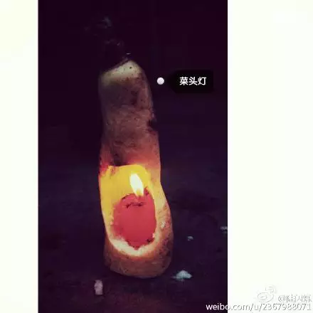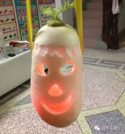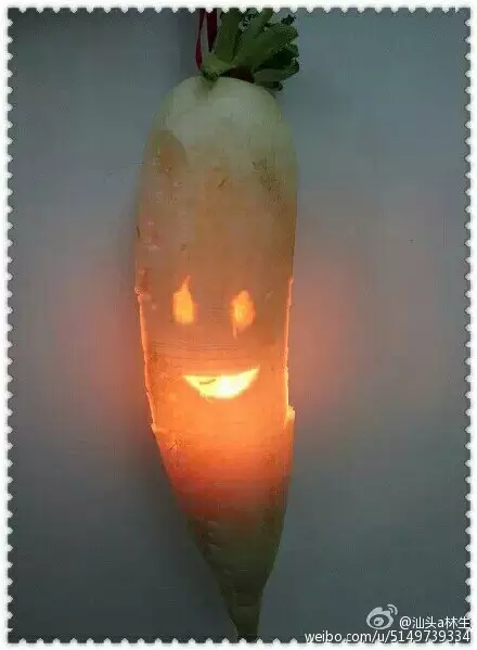 其实做法十分简单,只需要一根白萝卜跟一小枝蜡烛即可。一根萝卜可以制作两个,通常截取上半部分,将萝卜雕空,或是雕上正方形,然后把蜡烛放在雕好的萝卜里,再用一根小木棍跟钓鱼的鱼线吊住就是一个充满童年乐趣的“菜头灯”。