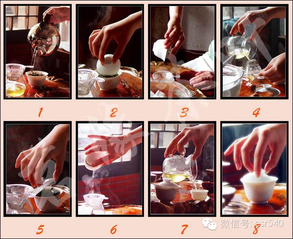 第二冲水冲入茶罐后,即要烫杯。这烫杯也属一绝,非潮人所不能。几个杯盛满腔了滚烫的水,执茶者先用拇指和食指捏起一个,侧入进第二个盅的滚水里,再用中指抵着盅底,快速转了一周,这杯已是洗了一个全方位的开水澡。如此循环过去,几个茶盅便又干净又温暖地待在那里。这时,冲罐里的茶正泡到好处,只把冲罐一提,一斟,只见金黄的一线茶水轻泻而出,立即茶香四溢,幽韵袭人。