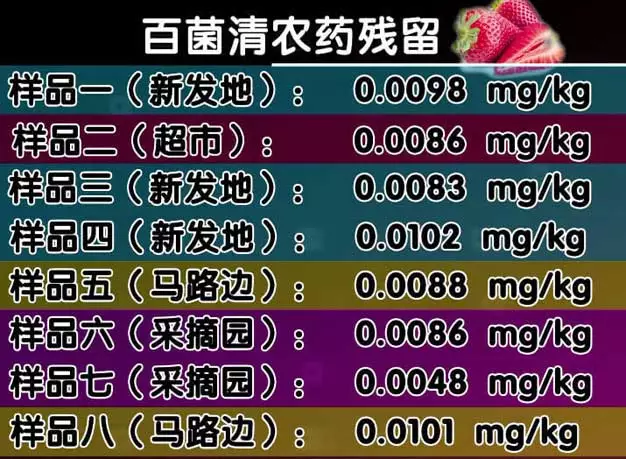 如果参照欧盟标准0.05毫克每公斤,那这些检出的样本里边,1号草莓样品乙草胺的最高残留量是0.367毫克每公斤,超标了7倍多,就连残留最低的3号样品,也超标了大约1倍。