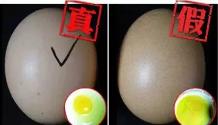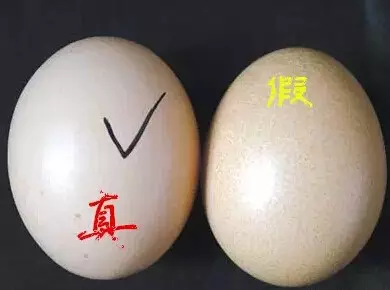 假鸡蛋外表、颜色和重量都和真鸡蛋差不多,但没有鸡蛋应有的腥味。而在照蛋灯下,假鸡蛋的气室是看得出来的,和真鸡蛋不同。这是由于假鸡蛋的蛋皮和蛋清中间有空隙。