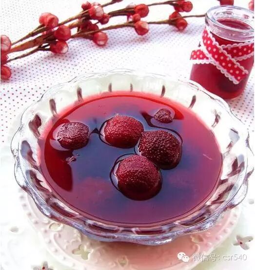 在夏天将杨梅冰冻起来,保留它的原汁原味,然后再将它做成羹,味道就完全融入了羹糊里。