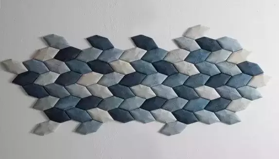 这些深浅不一的蓝色丝瓜瓷砖的染色剂为牛仔布印染工业废水,这些多余的工业废水是有毒的,然而丝瓜却可以将这些工业废水再吸收利用,成为漂亮而无害室内蓝色墙面装饰瓷砖。丝瓜络可是理想的声学绝缘体,因此这款丝瓜瓷砖也是很好的墙面吸音材料。
