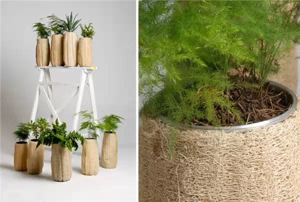丝瓜络做成的花盆,配以绿植,安静而朴素。