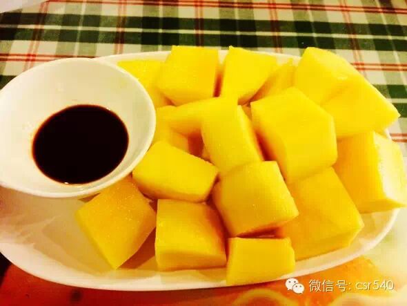 把芒果削好,放进冰箱,30分钟以后拿出,蘸上酱油水,真是美味呀甜腻,还可以助消化,防止芒果过敏。