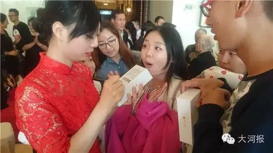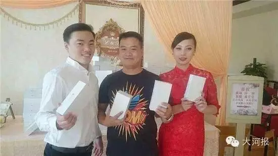 那高高堆砌的白盒子,很像苹果手机的外盒。没错,它真就是“iPhone6 Plus”的。新郎新娘相当敞亮啊,所有来宾人手一盒。“16G,4000多块RMB”。