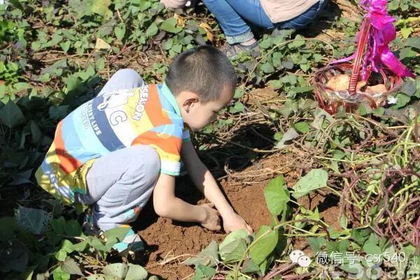 由于力气比较小,拿不动大锄头,就用小锄头从旁边慢慢的松土,然后拉着藤蔓把地瓜拔起来。这个季节,将地瓜放进灶里烤着吃,那叫一个香啊!