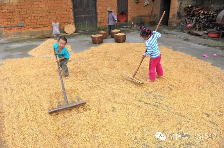 当打完稻谷后,就要用专门的耙将其铺开,并翻来覆去的晒。光着脚丫踩在稻谷上,来回踢来踢去,胜似做一次足底按摩。那个时候晒得一身黝黑。