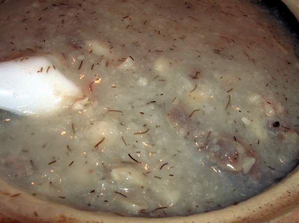 老火粥与老火汤的意思差不多,也就是长时间的煲煮出来,特点是米完完全全的煮融化,而且味道比较浓烈,用来搭配的材料一般都是味道浓厚以及比较耐住的,比如咸猪骨、菜干等等,而猪肝、鱼片这些不适合久煮。好的老火粥应该味道浓厚,能充分感受到食材的味道。常去咸猪骨的店铺常年会放置一个煤球炉在门口,炉上放置着一口大锅,慢慢的炖煮着一个锅咸猪骨粥,有客人要咸猪骨粥,便掀开锅盖,拿起勺子沿着一个方向搅拌一会儿再把咸猪骨粥盛入碗内,而此时店铺内外都是充溢着咸肉的香气,更别说接下来吃咸猪骨和喝粥的美景。
