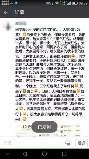 更坑的是,他酒实在喝得太多,以为第一个红包没发送成功,还是眼花,依葫芦画瓢,又发了一个5000元的红包到同一个同学群里。巨坑的是,这位班长还没酒醒,兴头上来,紧接着又发了一个5000元的红包,错手发到一个股票群里。一晚几分钟发出去1.5万元红包,秒变“财神”。