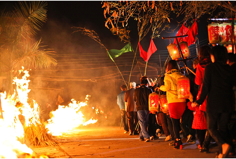 在普宁占垅溪东村每年的正月十六,就是一年一度的“跳火墩”日子。,村里的男孩要集体跳过12道用稻草燃烧起来的火堆。据说最早的跳火墩是男孩子成年的仪式,而到了后来,是去掉晦气、迎来新年的仪式。最重要的,是锻炼孩子们的勇气胆略与团队精神。