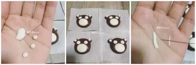 ③白色取1g,搓圆指腹轻轻按扁,轻轻放在可可面团上面,再用指腹轻轻按压下,取可可约0.8g,搓圆后再搓成长粗条,用针在中间压下去,一分为二