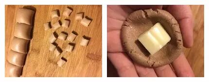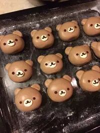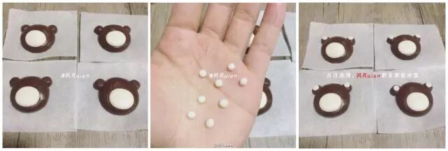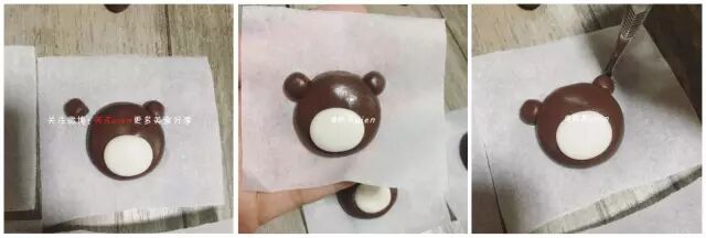 ④做头的糯米团包上芝士块,搓成圆圆扁扁的熊头