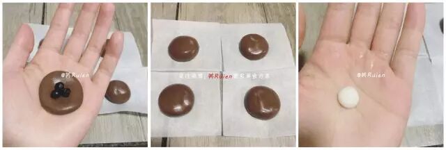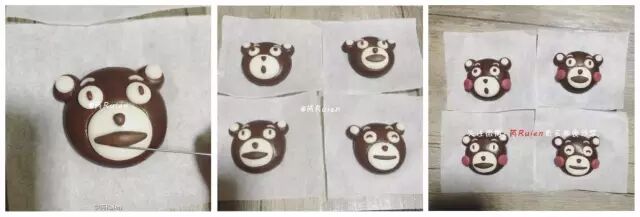 ⑪四个表情用同样方法就可以做出,最后红色的搓成均匀的球按扁后放上去再轻轻压压,大功告成啦~~~如果不马上吃就冷冻保存,一个个隔开放,也可以平放用袋子装好
