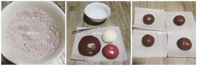 ①将糯米粉、可可粉、糖粉搅拌混合,牛奶慢慢倒入用筷子画圆圈搅拌(面粉吸水性不同,以揉成团为准),揉成团放在油纸上,准备好一根干净的针和镊子,还有一小碗水,油纸剪成一小张,可可面团搓成每个约9g的4个