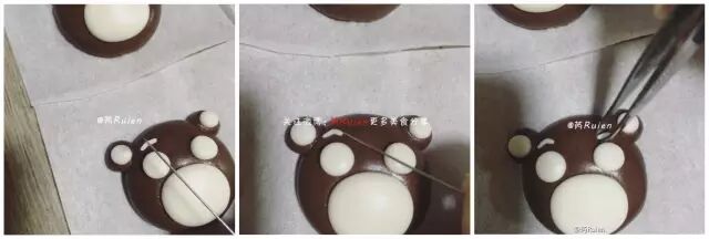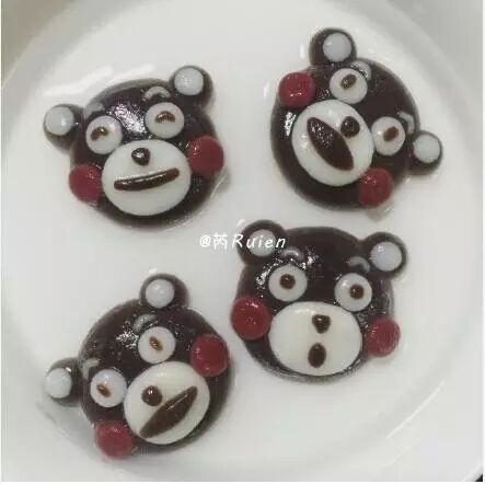 ①糯米粉加糖揉成团,分开一个大份,一个小份,大份的加可可粉揉成浅咖啡色,小份保持白色。再揉一小块面粉团,加多点可可粉,比大面团的颜色深,做眼睛鼻子嘴巴,因为我怕糯米粉煮了会化开,这部分就用面粉做了。
