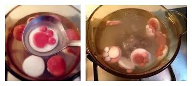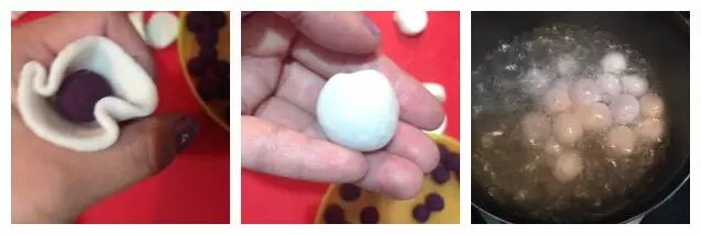 ⑫锅内加水烧开放入包好的汤圆,大火烧开,再加些冷水再次烧开,待汤圆完全都浮起来,要揭开锅盖中火煮8分钟左右。