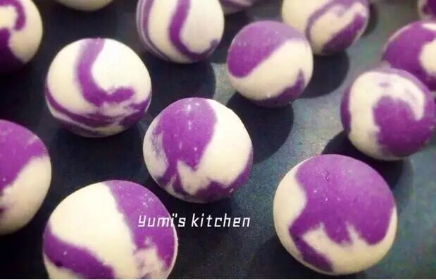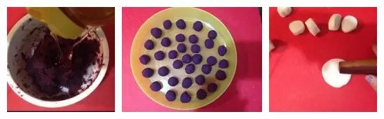 ③如果不用紫薯做馅,也可以做成黑芝麻汤圆,只要黑芝麻炒熟,加适量白糖打碎,加入适量猪油或黄油,搓成丸子稍冷冻定型后就可以做成馅。