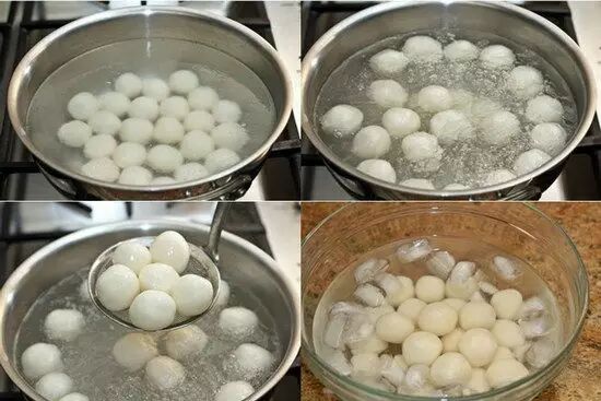 ④下水煮(注意不要粘底),等到飘起后再煮1分钟,然后放到冰水里。
