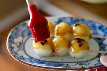 ⑨将丸子放在盘中,甜酱油酱轻轻刷在丸子表面
