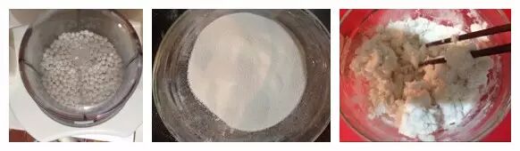 ①西米放入粉碎机里粉碎。因为西米很硬,如果用粉碎机,就粉碎30秒停一下以免烧坏机器,再继续如法重复进行多次粉碎。