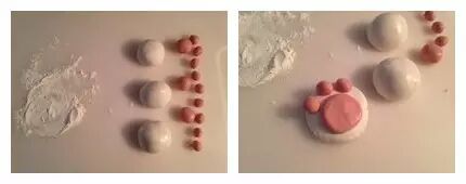 ⑤然后取白色搓成大小均匀的小球,小球先轻轻按扁下再放上去,压一压(别太用力,都是轻轻的,怕粘不牢就指腹沾点水)