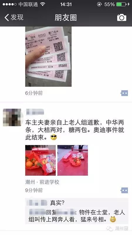 昨天传遍朋友圈的奥迪车挡住“迎老爷”去路事件,今天当事车主带上两条中华,两对大桔,两包糖果到老人组道歉,纠纷事件就此结束。希望大家原谅事主,和谐共处。