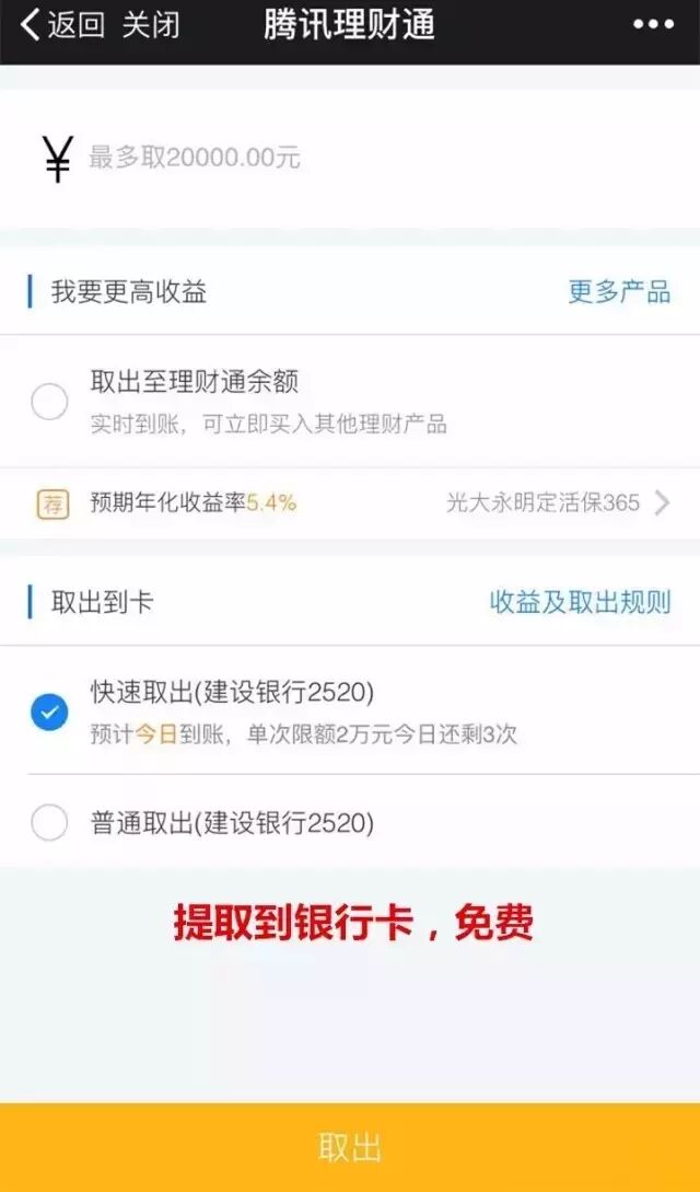第二步、从理财通里把钱转出到银行卡,这个终身免费!