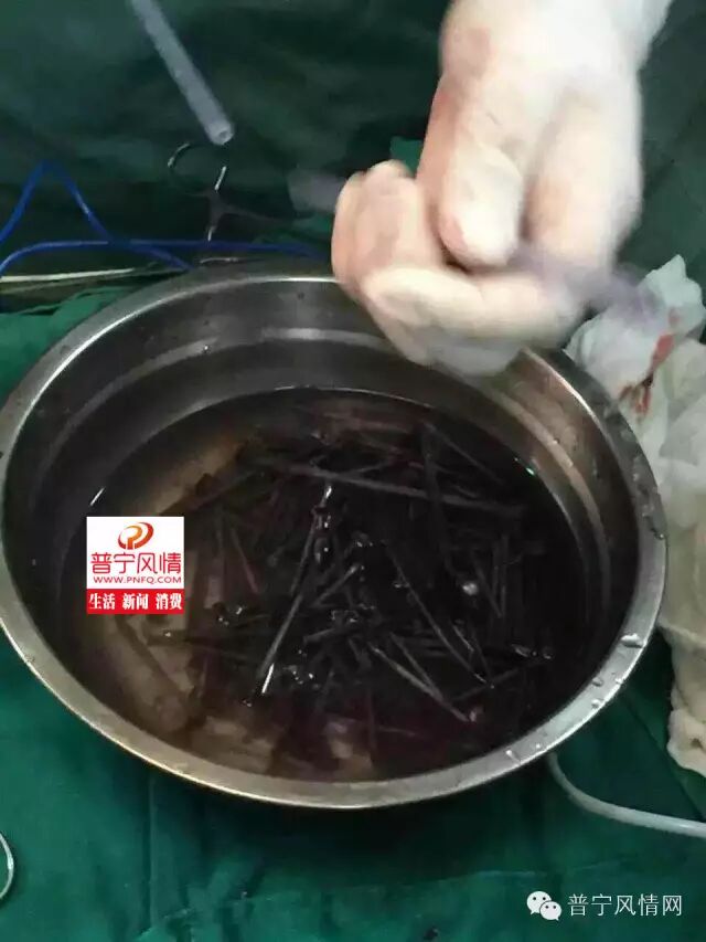 近日,风情君(微信号:pnfq188)获悉了一件非常不可思议的事情:揭西塔头镇一名21岁的男子用三个月的时间吞下了180根钢钉,后来因为身体不适(据称是吐血)被家人送往当地的卫生院检查,拍完X光后发现身体内有大量异物,随后被转至棉湖华侨医院接受手术治疗,最终棉湖华侨医院的医生在男子胃部取出超过180支钢钉,其中包括超过8公分的尖刀一把、超过10公分的剪刀头一把、还有6支超过5公分的钢钉。