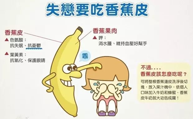 未成熟的香蕉皮中含有色氨酸,可以平稳血清素,缓解抑郁。剁碎、水煮,或榨汁均可。香蕉皮可以当成视力保健的饮料。但是,肾脏病以及糖尿病患者应该少吃。