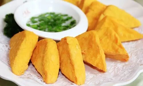 普宁炸豆腐是广东潮汕汉族传统菜之一,属于粤菜系。是将普宁豆腐切件,放入热油中炸制而成,吃时蘸上韭菜盐水,外酥里嫩,咸鲜微辣,风味独特。