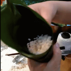 4、上部的粽叶向下折,直到完全盖住糯米为止。