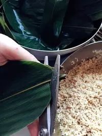 1.取2张洗过的干净粽叶,剪掉尾部的硬杆。
