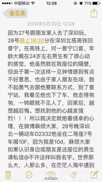 近日,汕头一位女网友(微博@不许这样叫我名字 )乘高铁时偶遇一位普宁口音的男子,竟然对其心动,于是上微博投稿求助,希望微博网友帮忙寻找这位一见钟情的心上人。