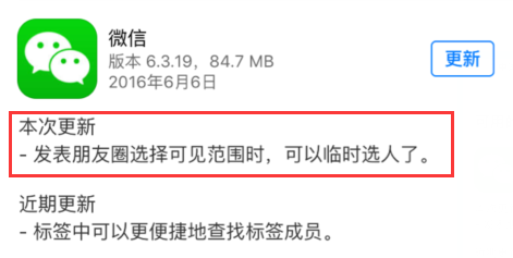 所以,要给大家分享一个好消息,最近,微信更新了一个重要功能!拿出你的iPhone,找到微信6.3.19版本的更新,你将看到,这次更新只有一个变动: