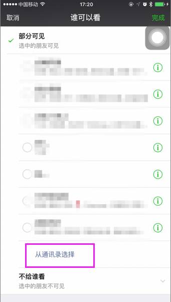 然后你就会发现,在你选择“部分人可见”或“不给谁看”时,除了原有分组外,还可以通过下方的“从通讯录选择”临时增加可见或屏蔽的人了!