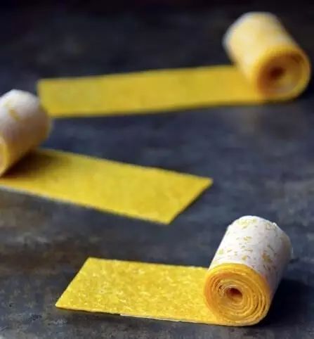 4、取出烤盘,将芒果泥揭起来后,用刀切成5com宽长条。
