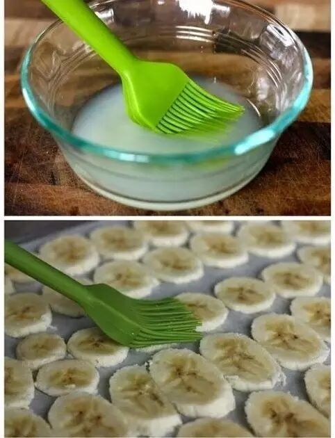2、将榨好的柠檬汁涂到香蕉片上。