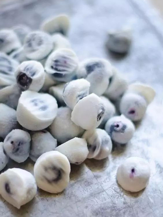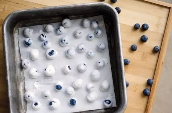2、将搅拌好的蓝莓放入托盘内,一颗颗放好,避免黏在一起。放入冰箱冷冻3-4个小时。