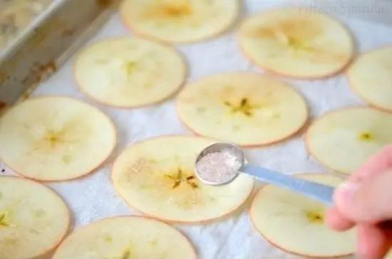 2、将苹果片均匀的铺在烤盘上,撒上肉桂粉和白砂糖,放入烤箱烘烤1个小时。