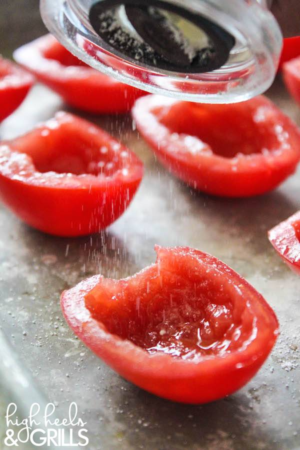 2、根据自己的口味,在西红柿上面撒上盐,放到烤箱里烤8小时。
