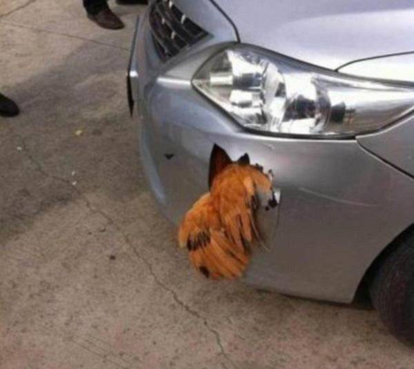 本以为鸡会受伤,没想到知识卡进了窟窿里,车主看到表示很无奈